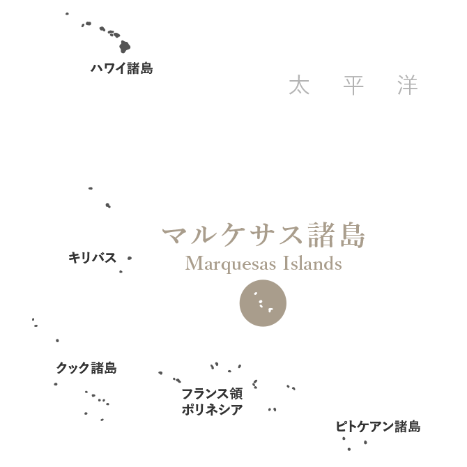 南太平洋にあるフランス領ポリネシアの中心地であるタヒチ島。世界でも有名なリゾート地です。「マルケサス諸島」は、そこから北東へ1,500kmの位置にあります。ヌクヒバ島やヒバオア島を中心に12の島々で構成され、そのうち6つが有人島です。珊瑚礁に囲まれたタヒチ島とは違い、切り立った崖の海岸線と深い緑の谷があり、亜熱帯のジャングルや手つかずの自然が多く残っています。また、マルケサス諸島は、手工芸が盛んでポリネシア文化の発祥地とも言われています。中でもヒバオア島は、画家ポール・ゴーギャンが愛し、最期を迎えた場所として知られています。