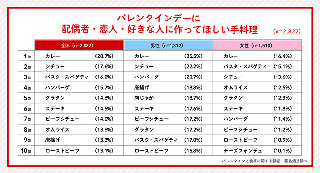 それでは、どんな手料理を作ってほしいのか伺ってみたところ、男性は「カレー」(25.5%)、「シチュー」(22.2%)、「ハンバーグ」(20.7%)、女性は「カレー」(16.4%)、「パスタ・スパゲティ」(15.1%)、「シチュー」(13.6%)が上位となりました。