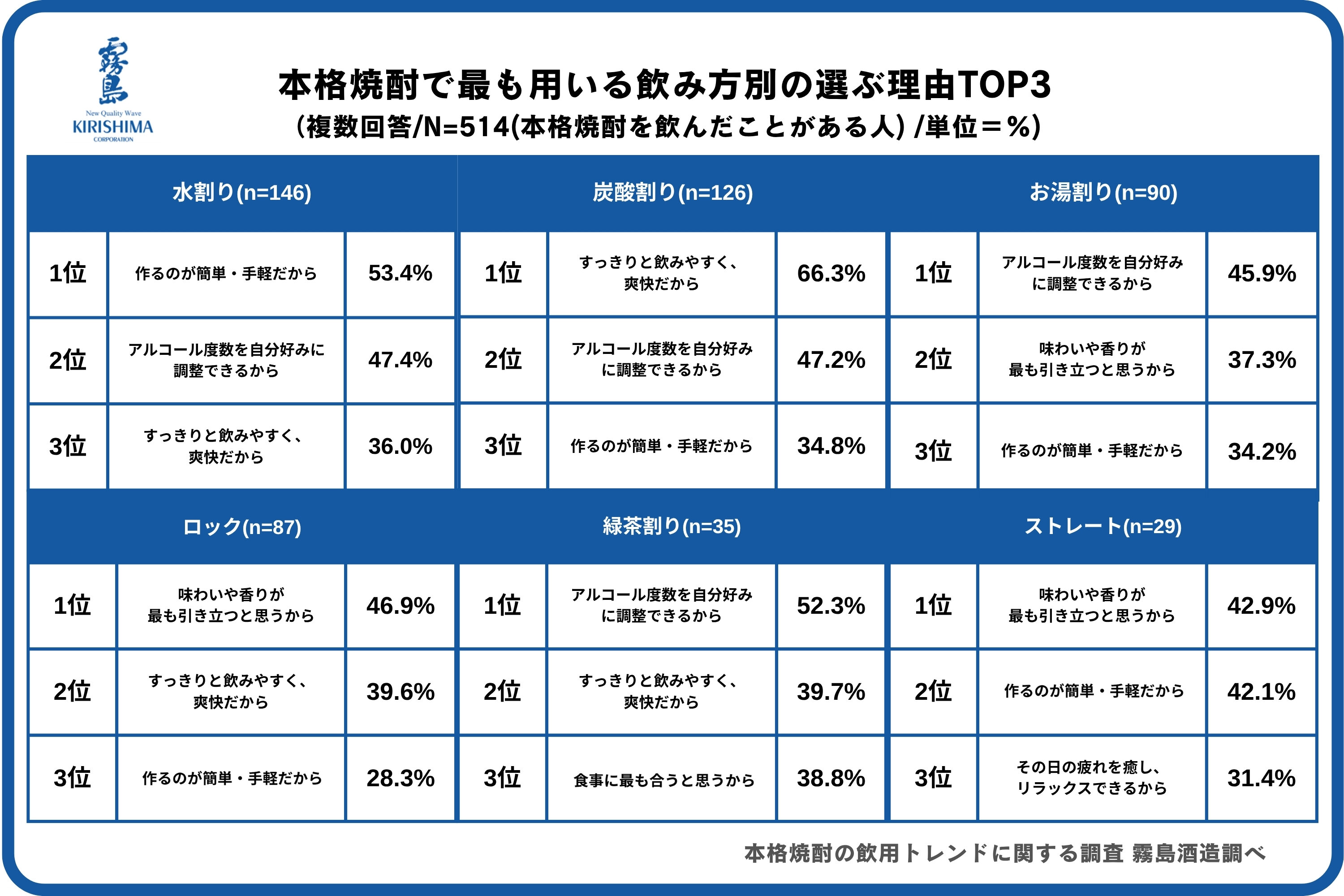 また、2位の理由「アルコール度数が高く、飲みにくいと感じる」に対しても、本格焼酎を飲んでいる層が飲み方を選ぶ理由として「アルコール度数を自分好みに調整できるから」と挙げている点や、炭酸割りなどの飲み方が広がっている点からも、時代に合った多様な焼酎の楽しみ方が伝わりきっていない現状が明らかになりました。