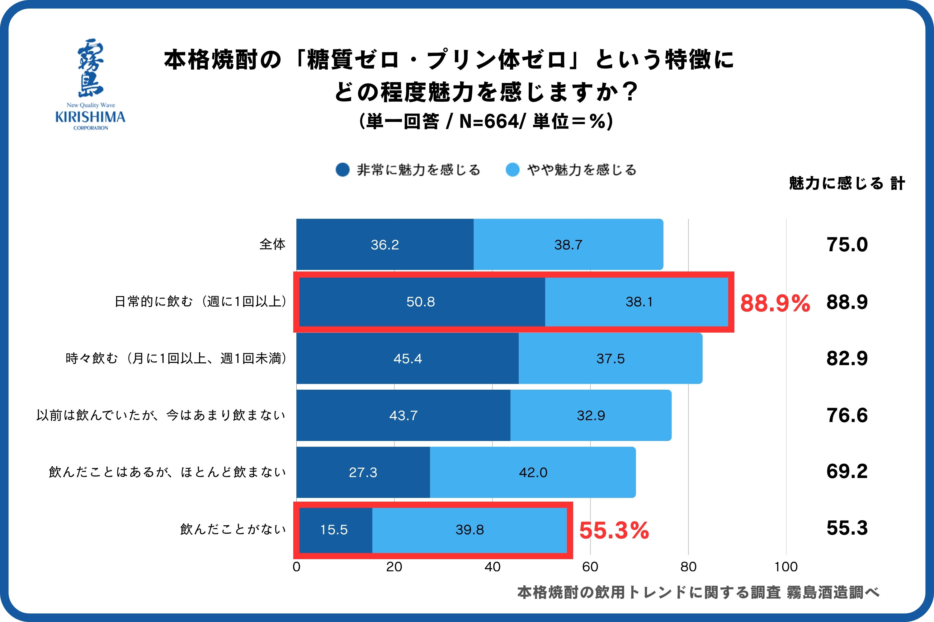 また、その特徴にどの程度魅力を感じるかを聞いたところ、「日常的に飲む(週に1回以上)」層では88.9%が魅力を感じると回答。一方、「飲んだことがない」層においても半数以上の55.3%が魅力を感じると回答し、認知度を大きく上回る結果となりました。本格焼酎の「糖質ゼロ・プリン体ゼロ」という特徴は、既存の本格焼酎を飲んでいる層にとどまらず、未経験層にとっても新たな興味喚起のきっかけとなる可能性があると言えます。